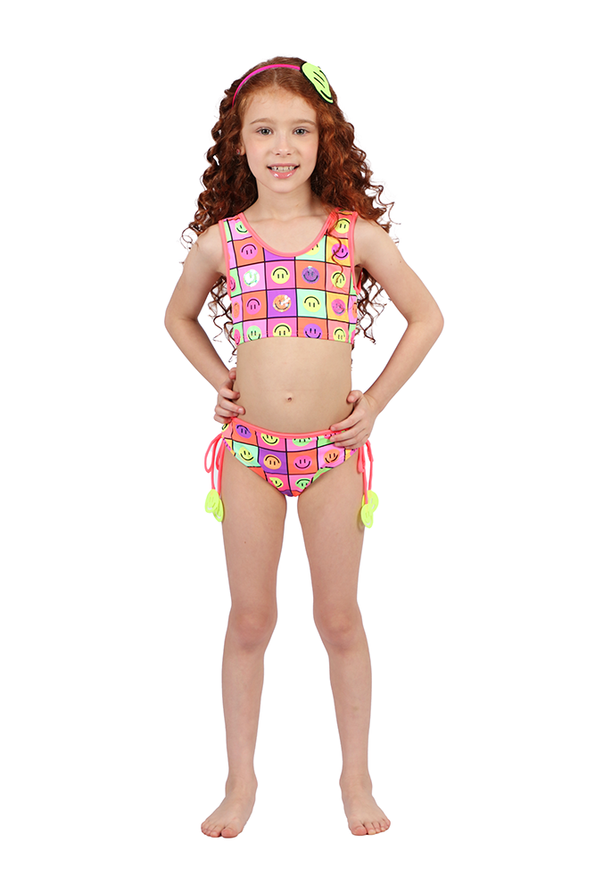 O Biquini Cropped Antonela Siri, em malha com Proteção UV 50+ prepara as pequenas para se divertirem na praia ou na piscina com muito estilo e conforto. É o look moda praia que toda menina deve ter! Esse conjunto de biquini com estampa esclusiva smile nas cores neon e aplicação de brilho, é uma peça que combina encanto, conforto e , o mais importante, proteção! Prefeito para a pele delicada das meninas nos dias ensolarados. Composição: 90% Poliamida 10% Elastano, Forro 80% Poliamida 20% Elastano