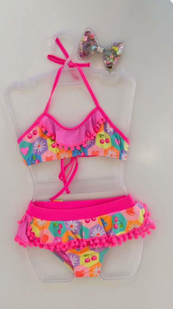 O Biquini Cropped Jessica da Siri, em malha com Proteção UV 50+ prepara as pequenas para se divertirem na praia ou na piscina com muito estilo e conforto. É o look moda praia que toda menina deve ter! Esse conjunto de biquini com estampa esclusiva Happy Cherry nas cores neon e aplicação de pomponzinhos, é uma peça que combina encanto, conforto e , o mais importante, proteção! Prefeito para a pele delicada das meninas nos dias ensolarados. Composição: 90% Poliamida 10% Elastano, Forro 80% Poliamida 20% Elastano