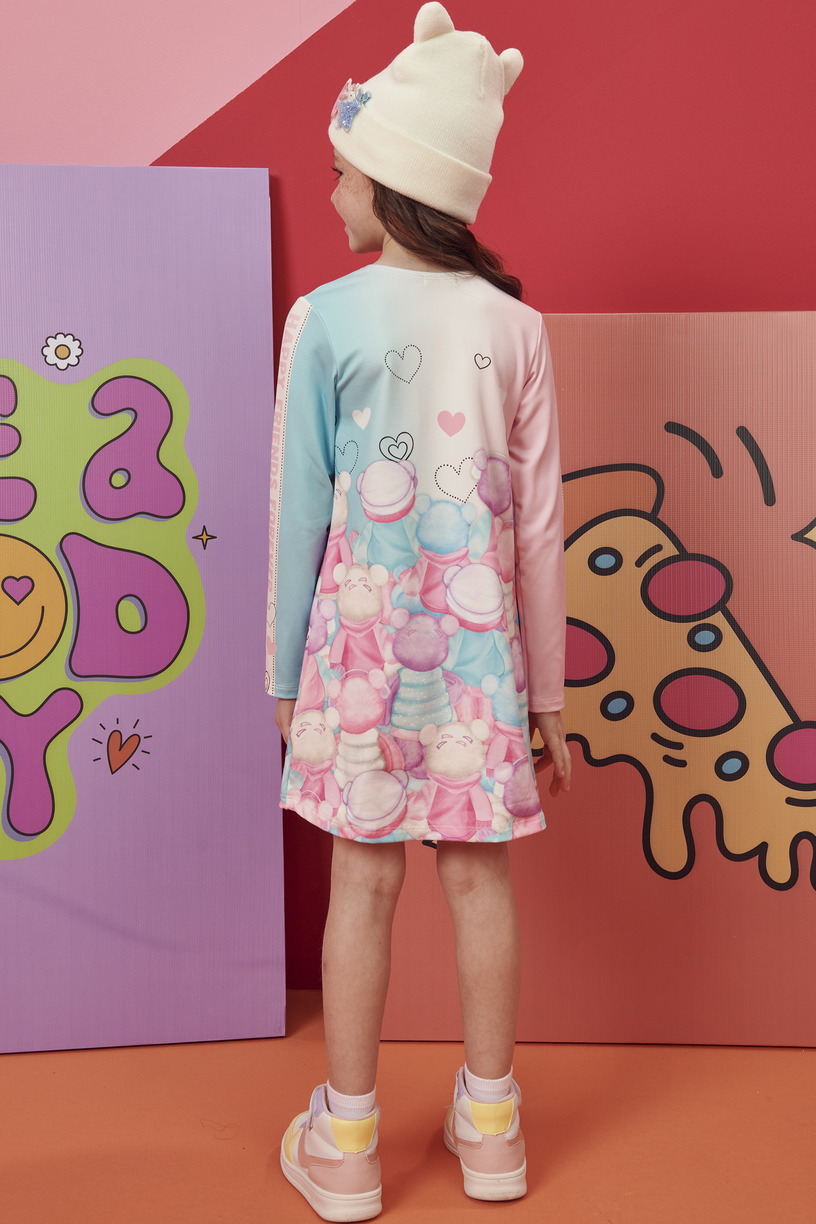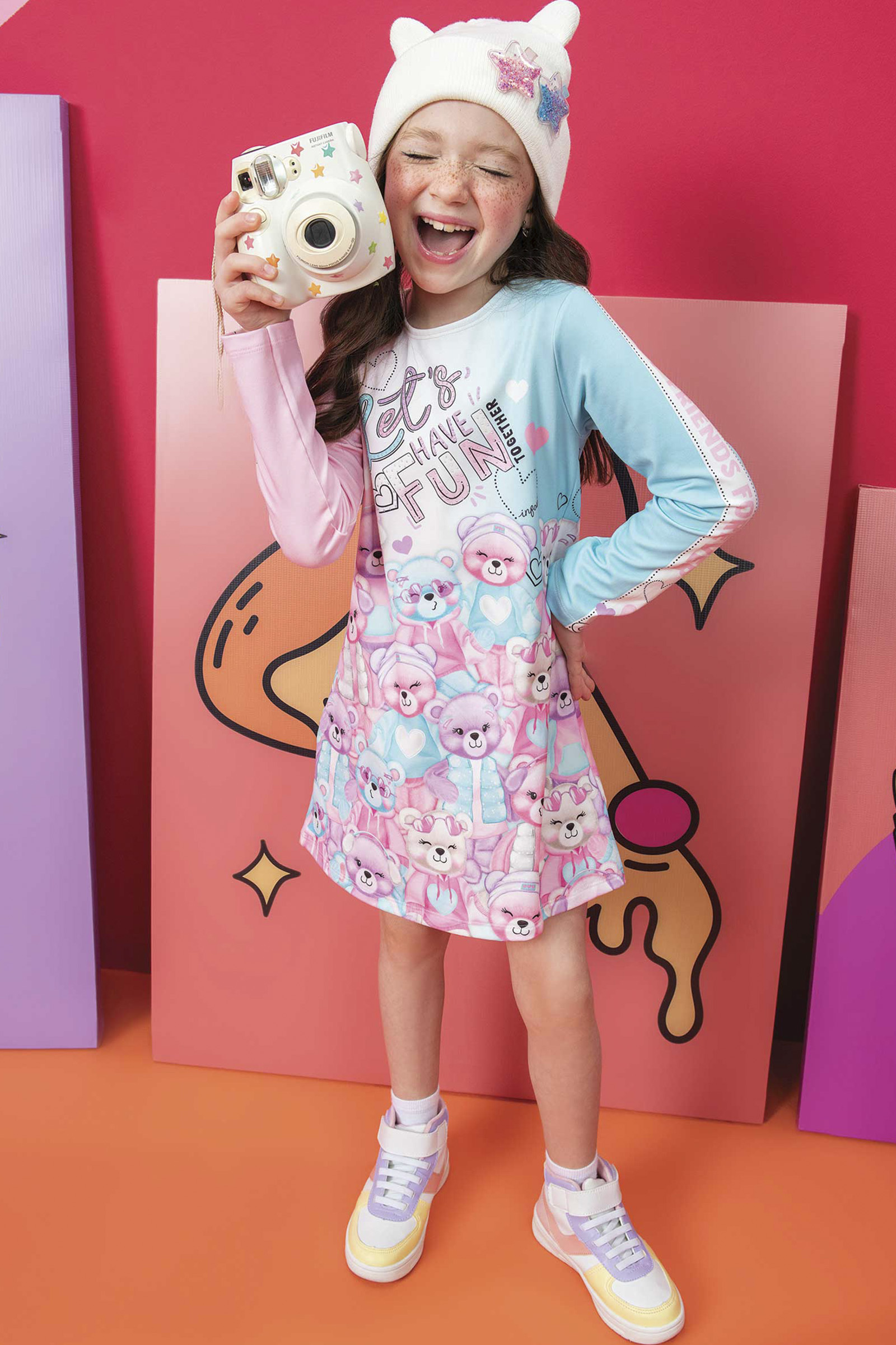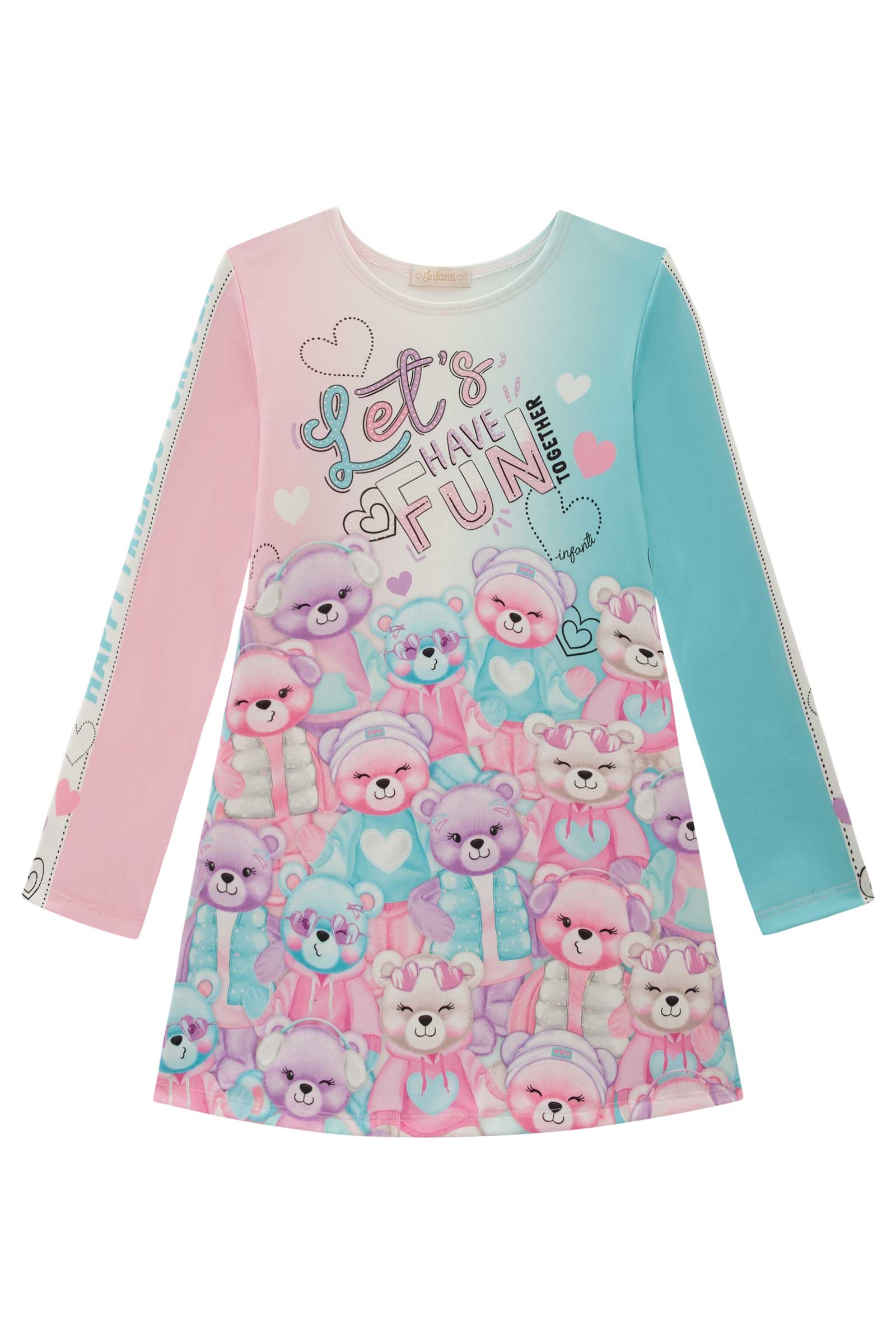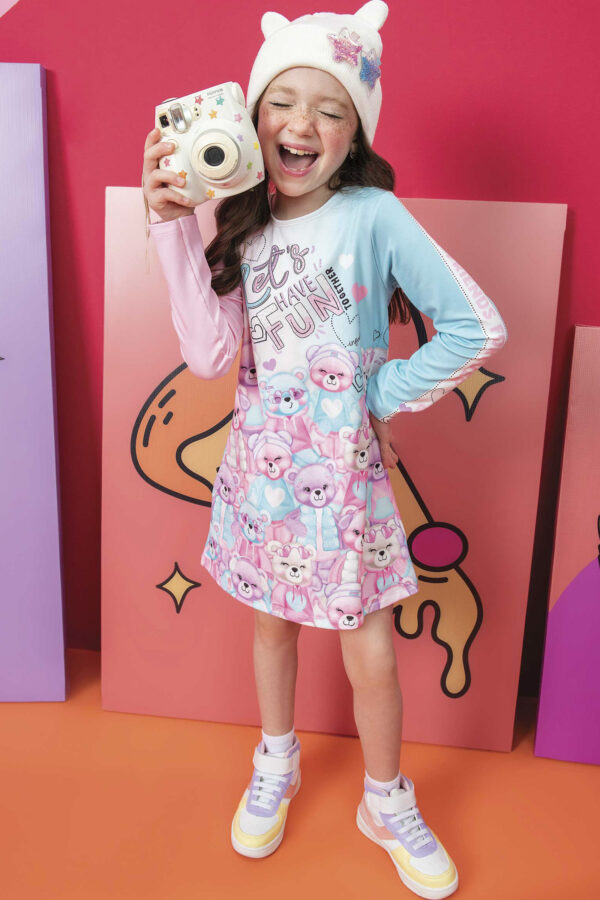 Vestido Colorido em Termoskin Infantil Menina. O vestido é confeccionado em termoskin, tecido com proteção térmica perfeito para os dias frios de inverno. Possui estampa frontal de ursinhos. Detalhe de mangas em estampa rotativa em lettering. O vestido é a peça chave para o closet das meninas em todas as estações. Aposte em combinações com jaquetas quentinhas, meia calça e tênis confortável para dias de muito estilo e diversão. Composição: 90% Poliester 10% Elastano.