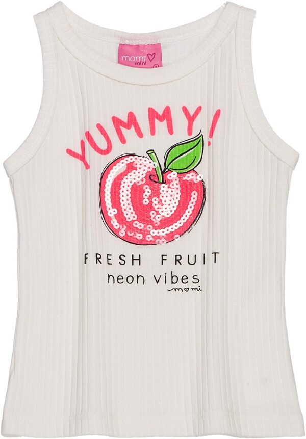 Esta regata off wite perfeitamente embelezada com estampa de fruta, oferecendo um visual vibrante e feminino. Ideal para os dias de calor, combina com shorts ou saias, proporcionando um look confortável e estiloso para as pequenas aventureiras.