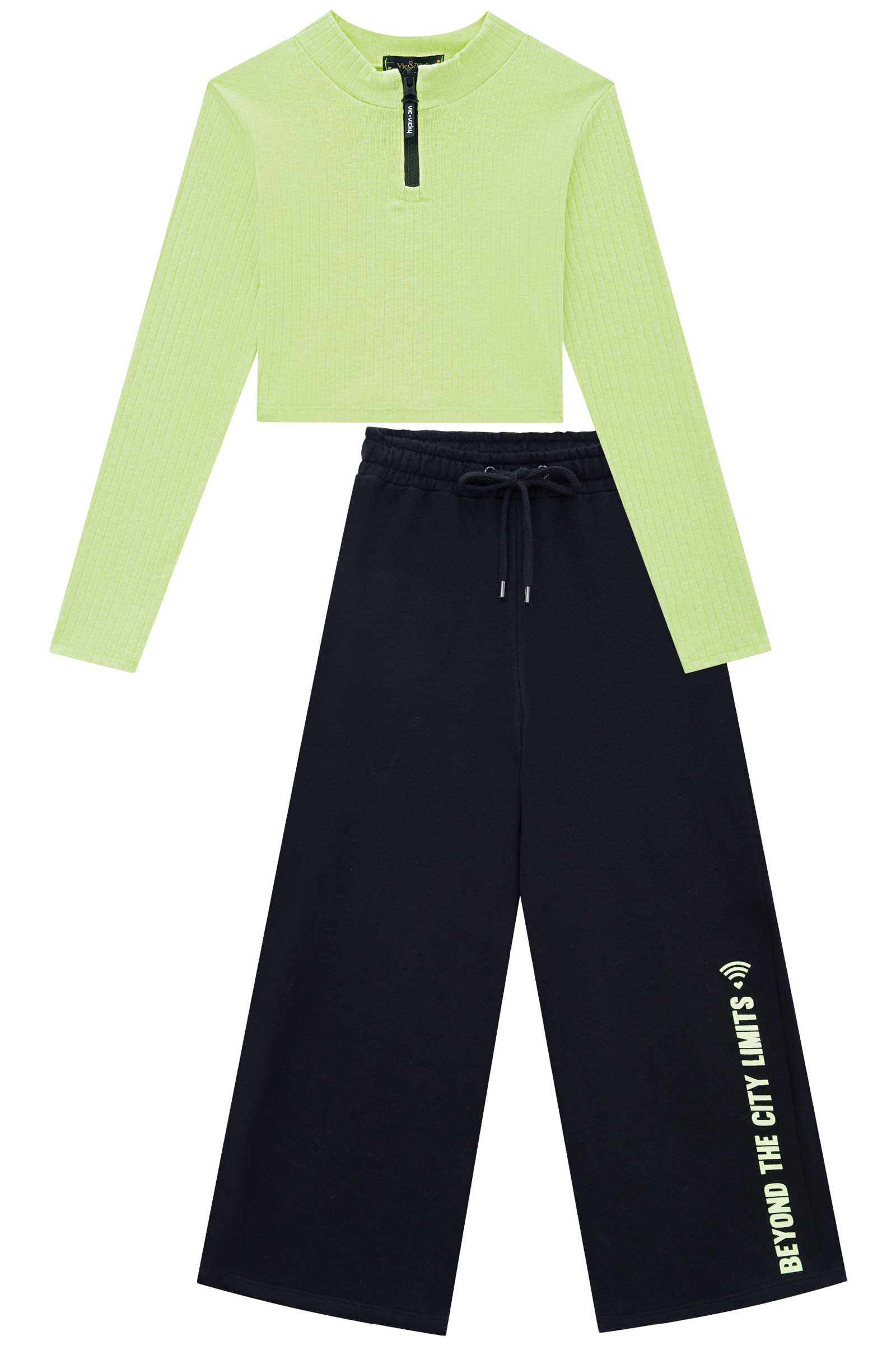 O conjunto de blusa cropped e wide leg em moletom é a escolha perfeita para as teens que buscam conforto e estilo no dia a dia. A wide leg é confeccionada em moletom 100% algodão no preto e a blusa cropped 49% algodão no verde, um conjunto macio e aconchegante, esse conjunto é ideal para os dias de outono, proporcionando aquecimento e liberdade de movimento. Design moderno e despojado, o moletom, além de ser super macio e aconchegante, é um tecido leve e respirável, ideal para o dia a dia. Versátil e fácil de combinar: O conjunto de blusa cropped e wide leg é uma peça super versátil, que pode ser combinada com diferentes looks. Para um visual mais casual, use com tênis e acessórios básicos. Para um look mais moderno, combine com um tênis chunky ou bota. O conjunto também pode ser usado com outras peças do seu guarda-roupa, como jaquetas jeans ou coletes, criando diversos looks diferentes. Composição: Blusa Cropeed 49% Algodão 49% Poliéster 2% Elastano Calça 100% Algodão.