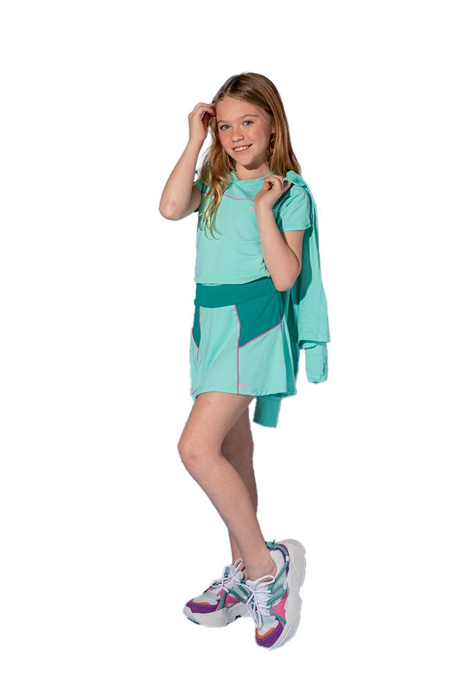 Blusa linha fitness na cor verde claro e detalhes no rosa com manga curta, feita com um tecido suave e preciso para oferecer liberdade de movimentos