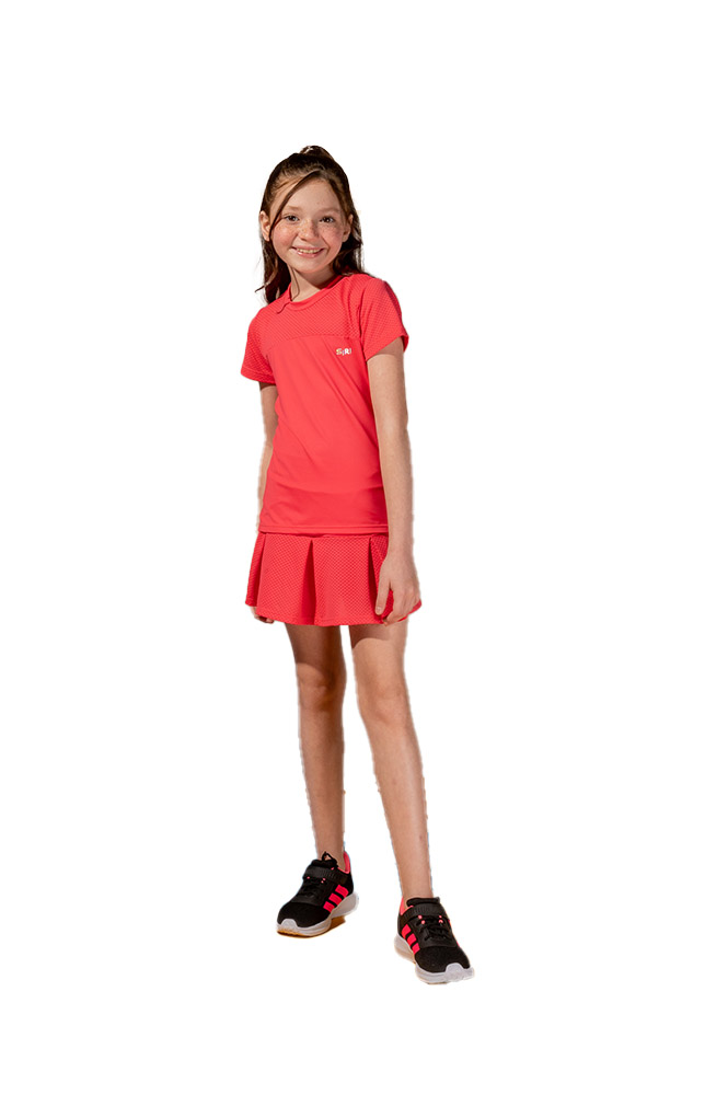 Saia linha fitness, composta com short na cor pitaya, feita para proporcionar flexibilidade e conforto, o tecido desta peça possui a tecnologia air, que permite a passagem do ar para facilitar a ventilação, a respirabilidade e a secagem do suor, e o conforto térmico.