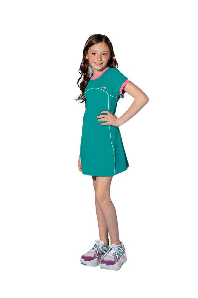 Vestido tenista verde com detalhes no rosa, acompanha short, tecido desenvolvido dispersar o suor proporcionando conforto e frescor