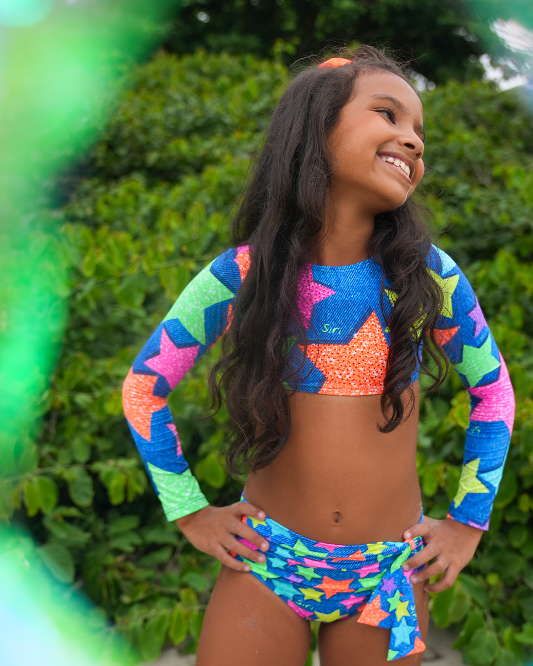 O Biquini Cropped Thais da Siri, em malha com Proteção UV 50+ prepara as pequenas para se divertirem na praia ou na piscina com muito estilo e conforto. É o look moda praia que toda menina deve ter! Esse conjunto de biquini com cropped de manga longa, com amarração nas costas para melhor ajuste e estampa esclusiva Star Jeans nas cores neon e aplicação de brilho, é uma peça que combina encanto, conforto e , o mais importante, proteção! Prefeito para a pele delicada das meninas nos dias ensolarados. Composição: 90% Poliamida 10% Elastano, Forro 80% Poliamida 20% Elastano