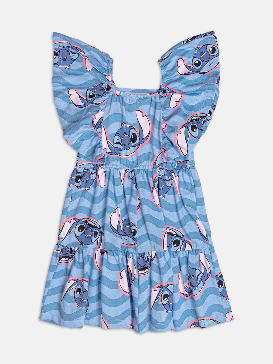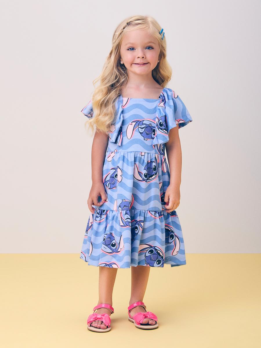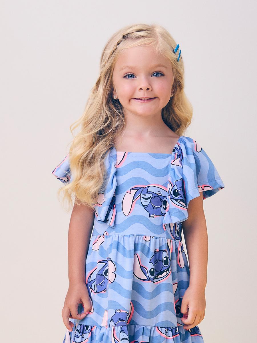 Este vestido é puro charme e diversão, com estampa exclusiva do Stitch por toda a peça, trazendo o icônico personagem em diversas expressões. O modelo apresenta babados nas alças, que criam um efeito delicado e romântico, enquanto o decote reto valoriza o design moderno. A modelagem soltinha com saia em camadas proporciona leveza e conforto para os movimentos. Ideal para um look alegre e descontraído, perfeito para dias de passeio.
