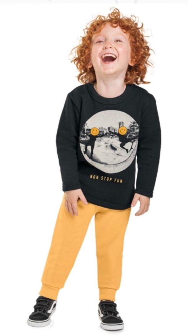Conjunto Infantil Smile Diversão Sem Parar, Com Blusão Na Cor Preta 100% Algodão, Traz Estampa Exclusa, Que Vai Encantar Os Pequenos Fãs Da Diversão! A Calça No Moletom 100% Algodão No Amarelo Mostarda Possui Cós Com Elástico Para Um Ajuste Prático E Confortável. Proporciona Muito Conforto E Liberdade Para Brincar O Dia Todo. Um Conjunto Perfeito Para Deixar Seu Pequeno Pronto Para Grandes Aventuras! Composição: Blusão 100% Algodão, Calça 100% Algodão